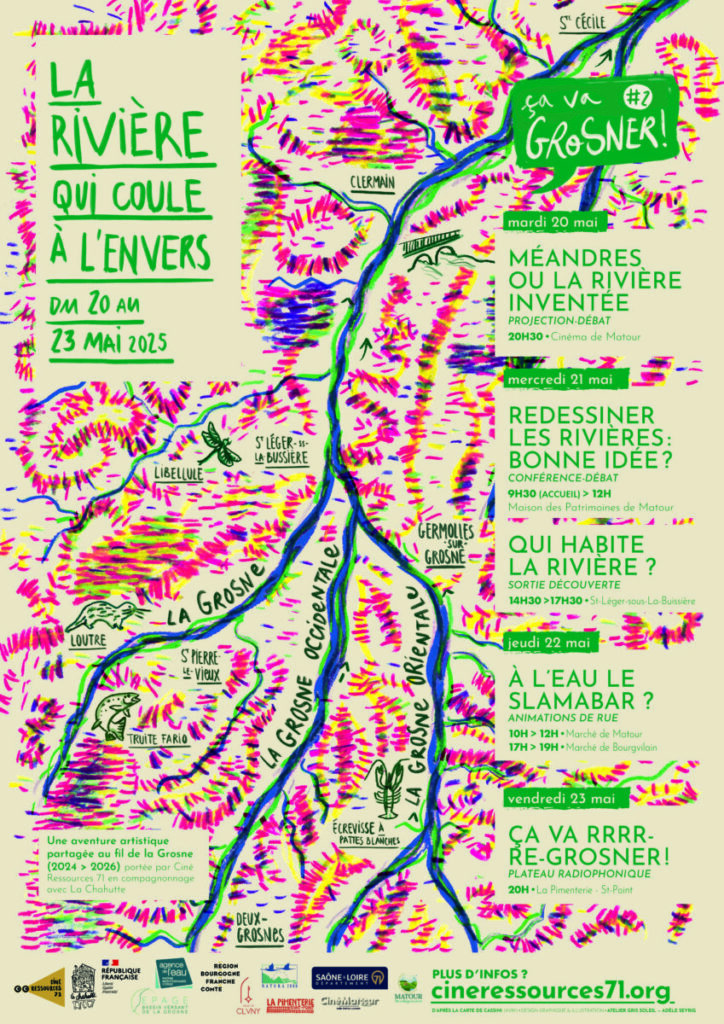 Du 20 au 23 mai 2025, nous nous sommes retrouvés sur la communauté de communes de Saint-Cyr-Mère-Boitier, avec au menu projection, conférence, balade découverte, animations de rue avec La Chahutte et une soirée de clôture le vendredi 23 mai à la Pimenterie, (annulée et reportée au 03/10/2025) autour d’un nouveau moment radiophonique : ÇA VA GROSNER #2 !